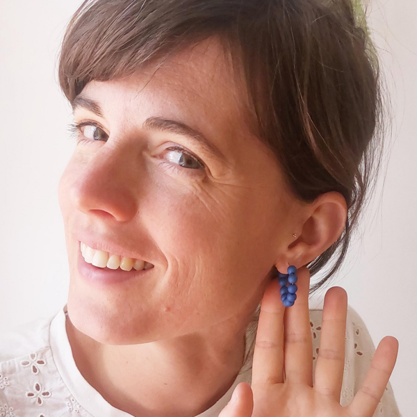 Mooie goudkleurige ringetjes (diameter 2,5cm), met matte kobalt blauwe kralen.