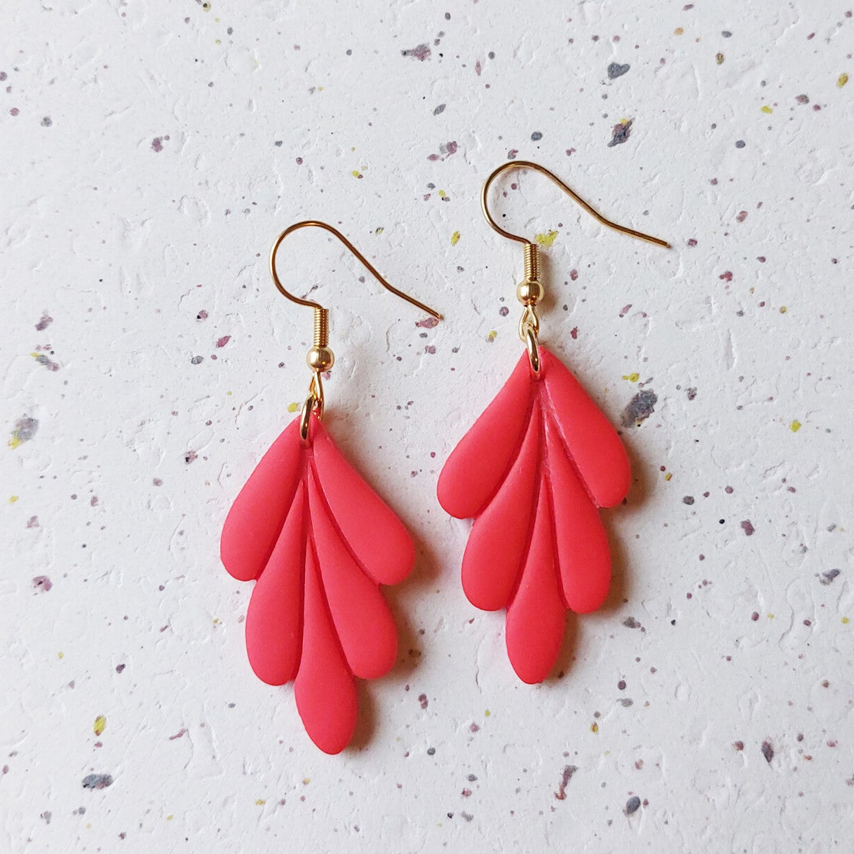 Zwierige waaiers in knallend rood. Met zilver- of goudkleurige hangers. Afmetingen (exclusief haakje): 2 cm breed en 4 cm lang.