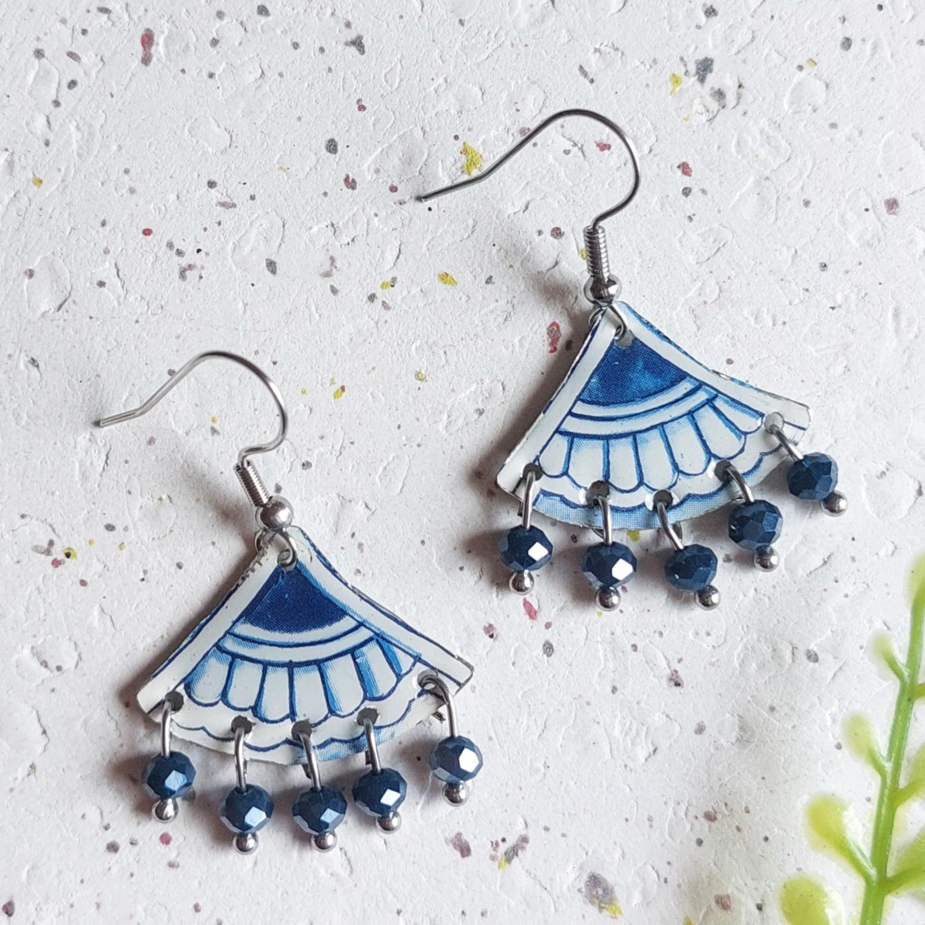 Een originele set oorbellen van vintage blik en stainless steel. Afgewerkt met een glanzende laag epoxy en vrolijke kraaltjes. Licht van gewicht, handgemaakt en uniek!