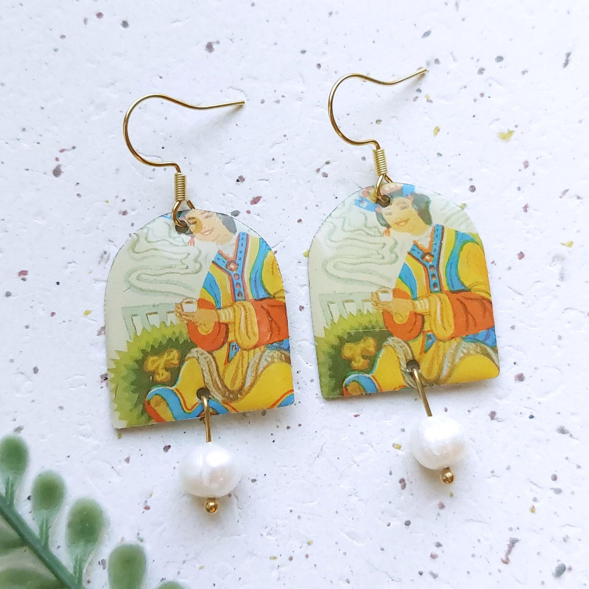 Een originele set oorbellen van vintage blik, zoetwater parels en stainless steel. Afgewerkt met een glanzende laag epoxy. Licht van gewicht, handgemaakt en uniek!