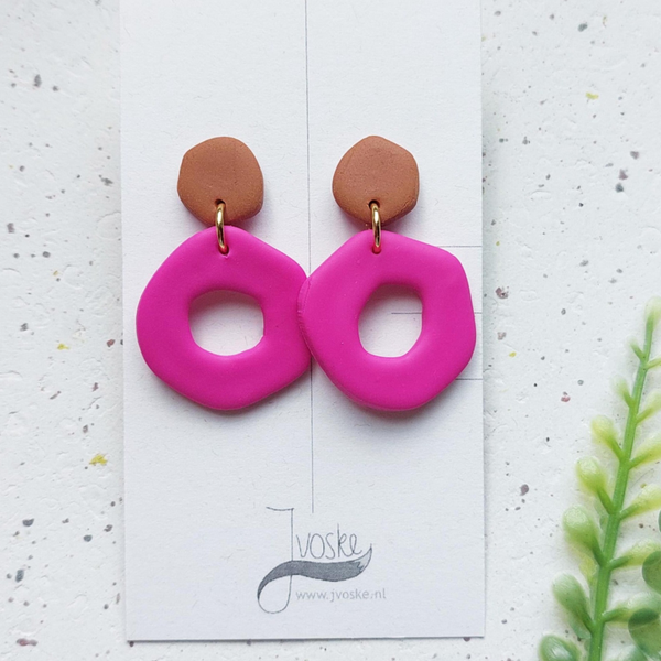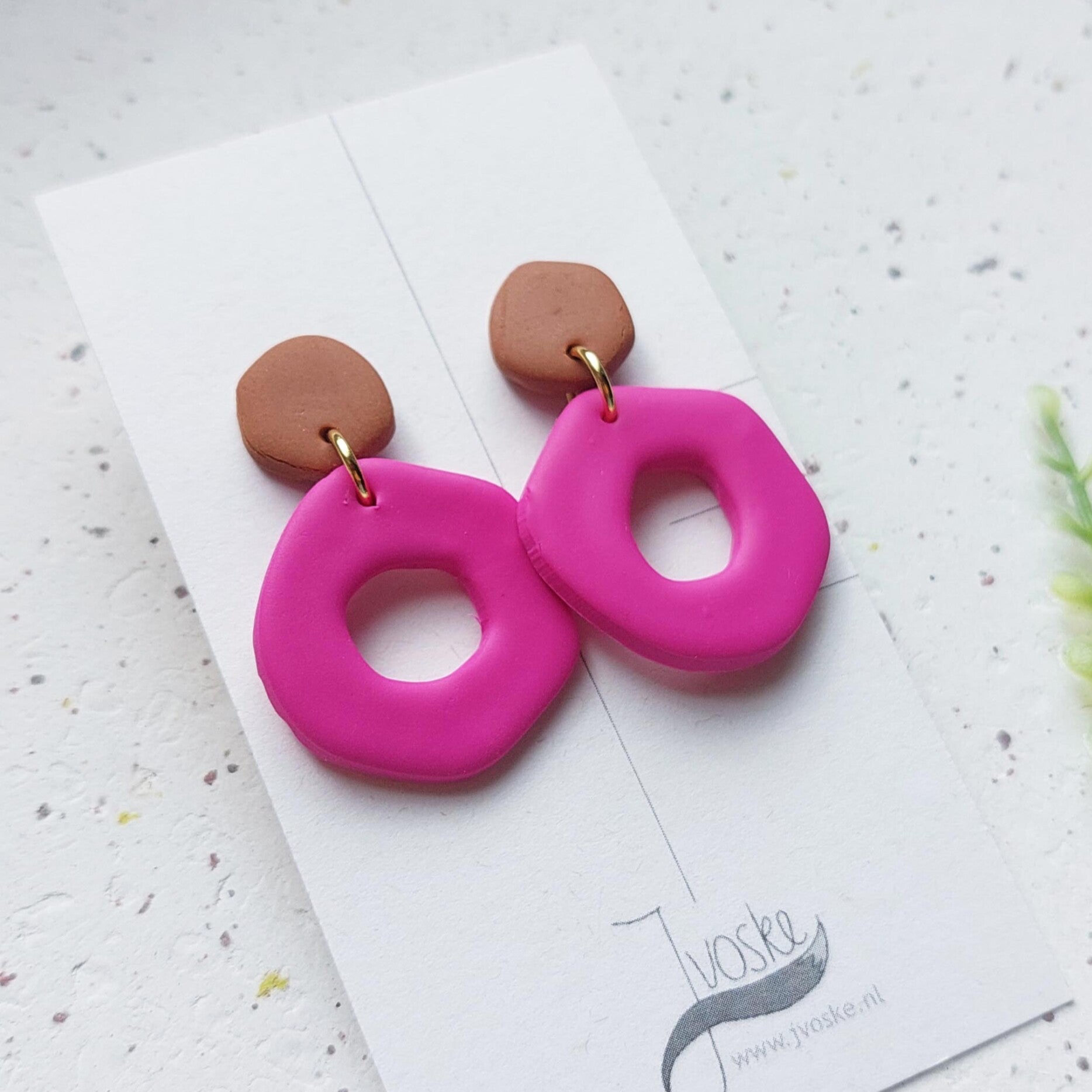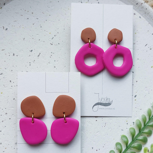 Stijlvolle matte oorbellen in fuchsia/bruin.