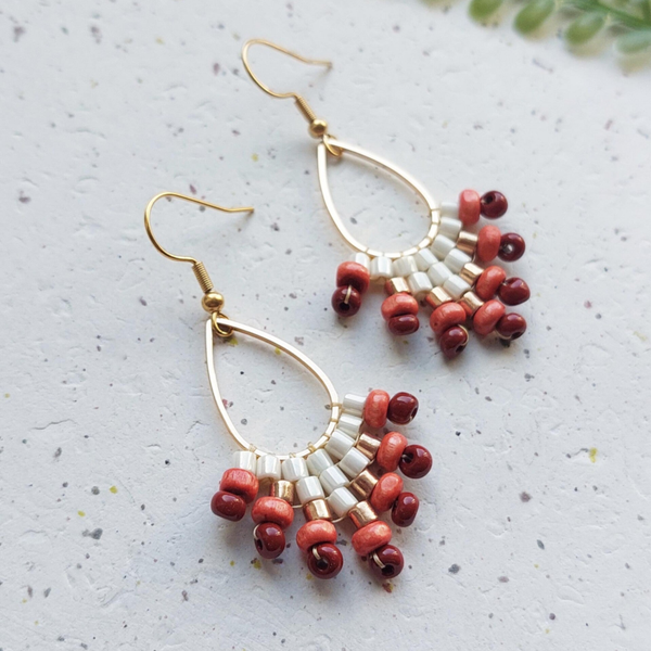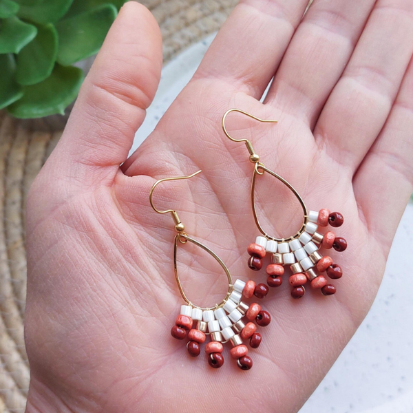Goudkleurige druppels (gold plated) met een weefwerk van herfstige Miyuki kralen.
