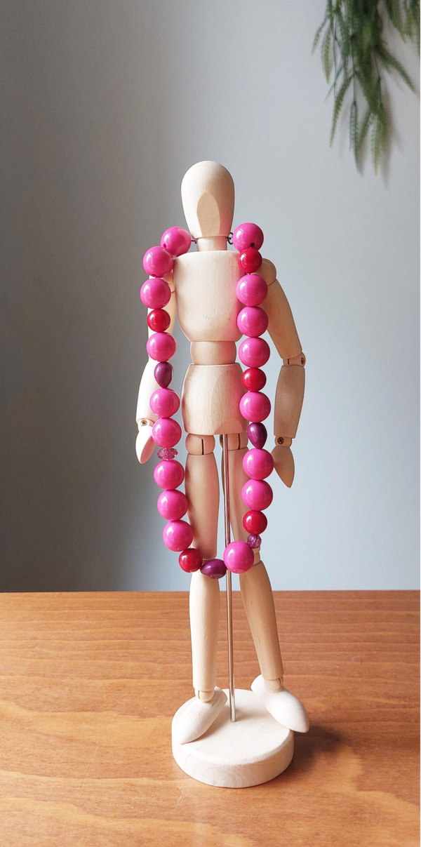 Ketting met mooie grote kralen (acryl, 18mm) in de kleur roze, effen of gemixt met vintage kralen. Met stainless steel slotje.