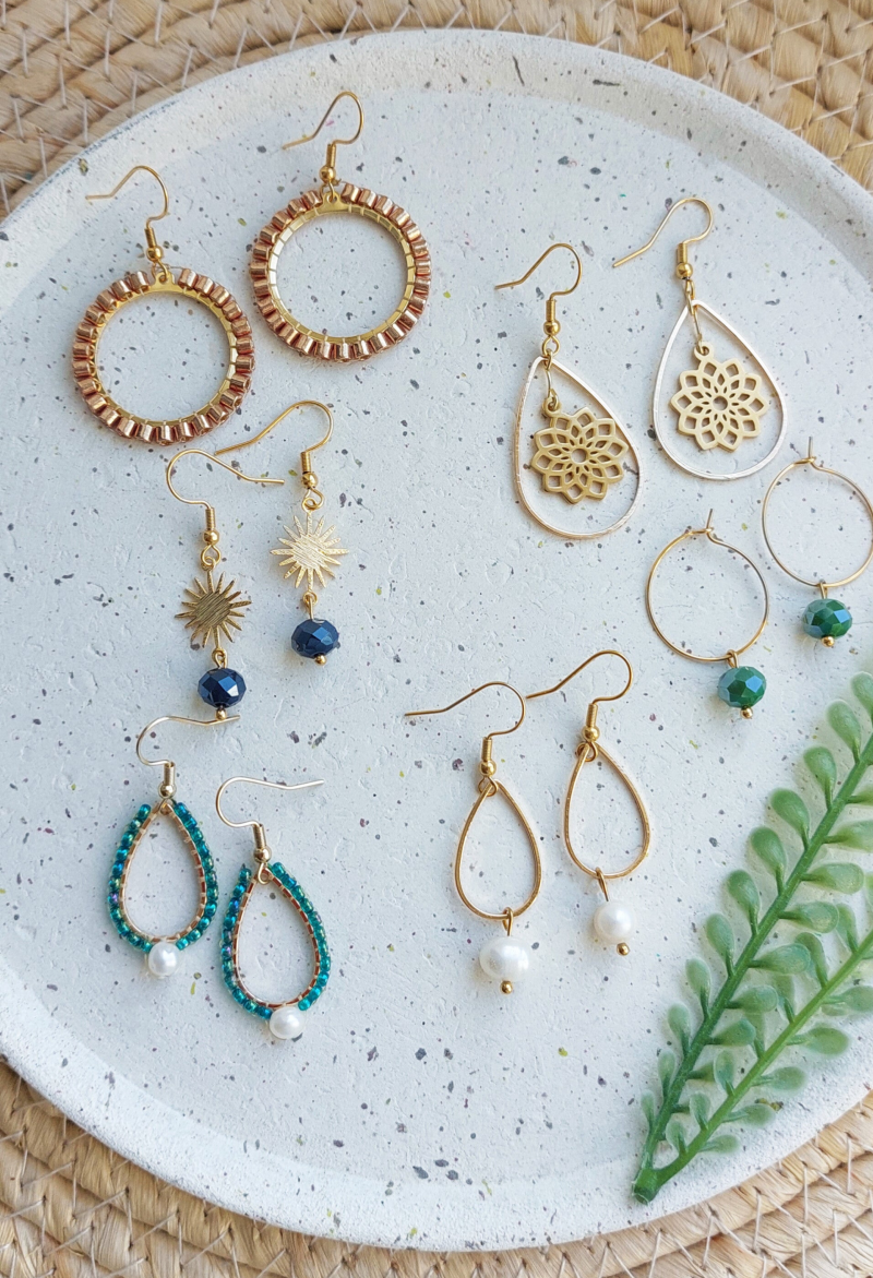 Mooie goudkleurige zonnetjes, met subtiele diepdonkerblauwe glaskraaltjes.